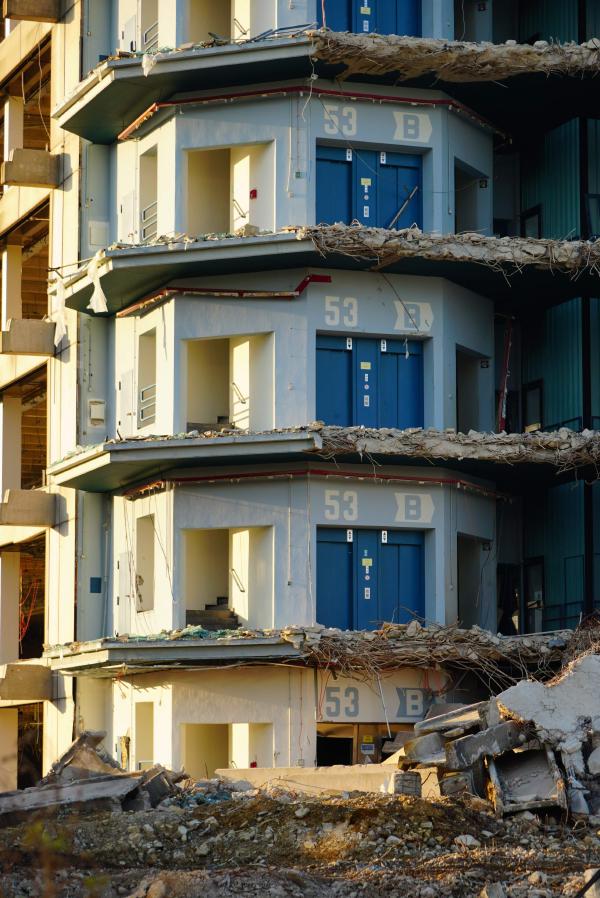 The sun shining through the empty shell of a building – a warm contrast against the cool concrete. Missing windows lack reflections.