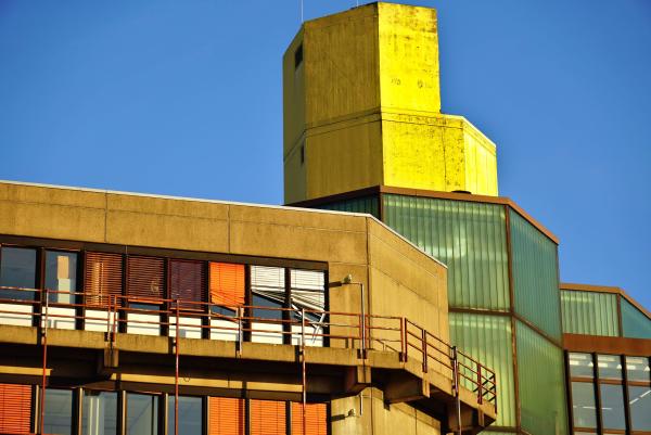 Disrepair, blue glass and yellow somethings on top. Is this decoration, or does it have some physical purpose? I know at least that there is a lab experiment where we measured athmospheric muons on different levels in the building, the idea being that the thick concrete floors will retain a fraction of muons – leading to more muons being measured in the top floors.